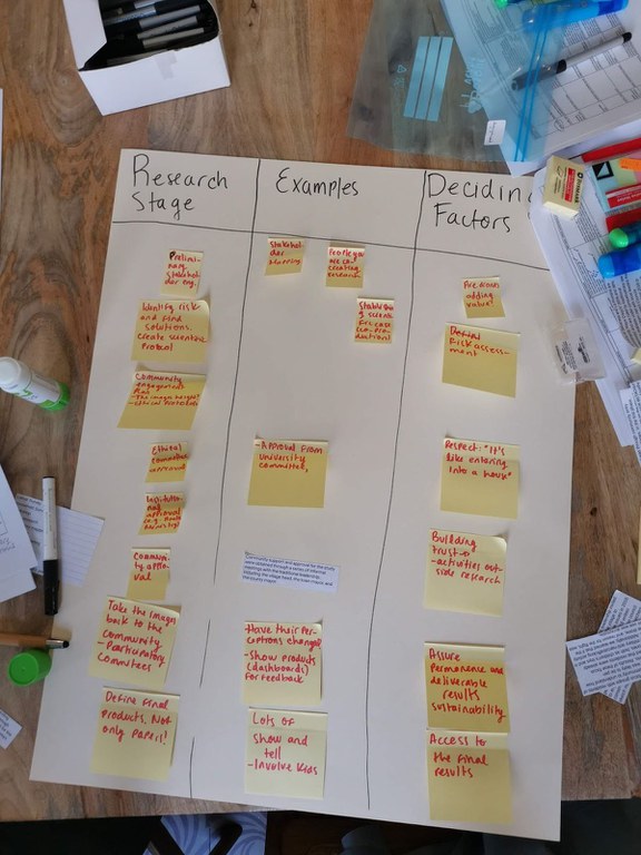 The first exercise focused on the researcher's perspective, thinking through the whole research process from study design to sharing the results, and discussing what ethical considerations need to be taken into account during each phase. The second exercise focused specifically on community engagement, thinking through concerns the community might have and what the key communication strategies should be to ensure the community feels safe and respected. The extensive fieldwork experience of the experts led to the sharing of some great examples of how to form good relationships with communities. This covered the importance of having someone in your team who already has a link to the community. Organising hands-on educational activities and drone demonstrations in your community engagement can help increase understanding of the research activities and can open the door for community members to voice their input as well. Community members know their environment best and can often advise on the best areas to fly the drone or help interpret the resulting maps. The importance of sharing results at the end of the study, including those not directly related to the study goals but that add value to the community, was emphasised as an issue that deserves more attention in research.